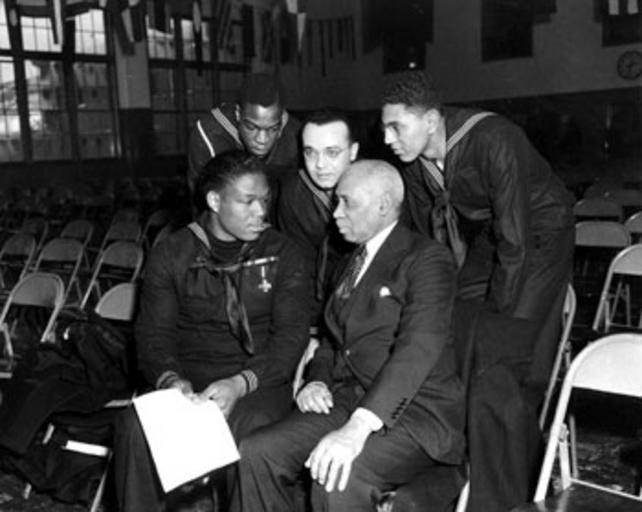 | Keywords: Blackhist2.jpg Dorie Miller speaking with sailors and a civilian at the Naval Training Station in Great Lakes Illinois January 7 1943 Source http //www baystatebanner com/issues/2007/12/06/news/Blackhist10110726 htm Source page describes photos as Official U S Navy photographs now in the collections of the National Archives 1943-01-07 PD-USGOV-MILITARY-NAVY page is/was http //en wikipedia org/w/index php title Image 3ABlackhist2 jpg here All following user names refer to en wikipedia 2007-12-11 02 15 Rklawton 350×279×8 24783 bytes <nowiki>Miller speaking with sailors and a civilian at the Naval Training Station in Great Lakes Illinois January 7 1943 Source http //www baystatebanner com/issues/2007/12/06/news/Blackhist10110726 htm</nowiki> 1943 in Illinois African American soldiers Naval Station Great Lakes Dorie Miller |
