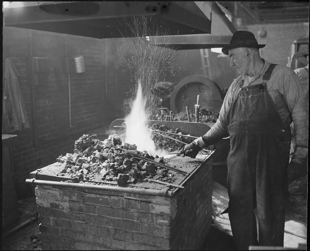 Keywords: Blacksmith and his forge. The Pocahontas Corporation, Mines 33-34, Bishop, Tazewell County, Virginia. - NARA - 541077.tif Scope and content General notes 541077 Local identifier 245-MS-2050L Department of the Interior Solid Fuels Administration For War 04/19/1943 - 06/30/1947 NARA-Author Lee Russell 1903-1986 Photographer 2489414 <br /> Still Picture Records Section Special Media Archives Services Division NWCS-S National Archives at College Park 8601 Adelphi Road College Park MD 20740-6001 1946-08-27 Record group Record Group 245 Records of the Solid Fuels Administration for War 1937 - 1948 Record group ARC 572 Photographs of the Medical Survey of the Bituminous Coal Industry compiled 1946 - 1947 Series ARC 540230 File unit File unit ARC Variant control numbers NAIL Control Number NWDNS-245-MS-2050L yes Other versions <gallery> File Blacksmith_and_his_forge _The_Pocahontas_Corporation _Mines_33-34 _Bishop _Tazewell_County _Virginia _-_NARA_-_541077 tif tif File Blacksmith_and_his_forge _The_Pocahontas_Corporation _Mines_33-34 _Bishop _Tazewell_County _Virginia _-_NARA_-_541077 jpg jpg </gallery> NARA-cooperation PD-USGov NARA TIF images with categorized JPGs Virginia Coal mining in Appalachia August 1946 in the United States Bib overalls Black and white photographs Black and white photographs of men at work Black and white photographs of standing men Virginia Black and white photographs of the United States in the 1940s Black and white photographs of Virginia Blacksmiths from the United States Virginia Males with gloves Men at work in Virginia Men facing left and looking left Men with hats 1946 in Virginia People of Virginia People of the United States in 1946 Tazewell County Virginia 20th-century men of the United States 27 August
