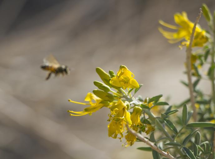 Keywords: joshua tree joshuatree national park nationalpark desert california mojave bladderpod peritoma arborea peritomaarborea honeybee rattlesnake canyon rattlesnakecanyon outdoor plant flower depth of field NPS/Brad Sutton NPS/Brad Sutton