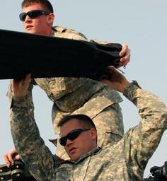 Keywords: Blades Off DVIDS78898.jpg en Pfc Brian Smith from Laceyville Pa and Spc Ray O'Neil from York Pa help lower the blade of an AH-64 Apache Longbow helicopter to the ground March 1 Each blade weights approximately 150 pounds Smith and O'Neil are members of Troop N 4th Squadron 3rd Armored Cavalry Regiment which is assigned to Multi-National Division - Baghdad's Task Force XII U S Army photo/Sgt Brandon Little 2008-03-01 https //www dvidshub net/image/78898 78898 2008-03-01 14 34 TAJI IQ PD-USGov AH-64 Apache Images from DoD uploaded by Fæ 4th Squadron 3rd Cavalry Regiment |