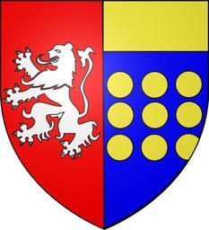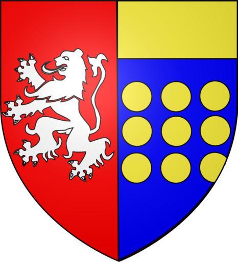 Keywords: Blason de Bruyères de Melun.svg Parti au premier de gueules au lion d'argent qui est de Bruyères au deuxième d'azur aux neuf besants d'or et au chef du même qui est de Melun own Nicolas C 2009-07-07 Lions rampant argent Coats of arms of the family of Melun |