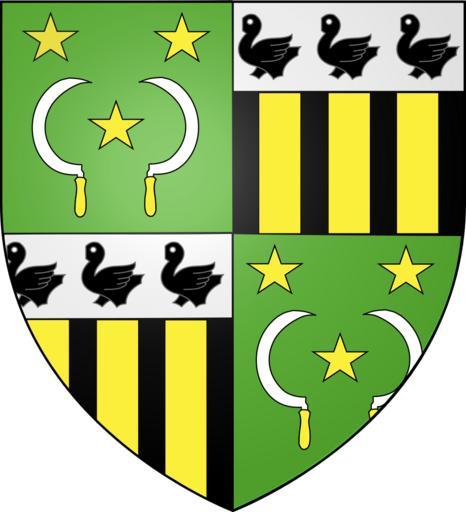 Keywords: Blason de la famille van Cutsem.svg Écartelé aux 1 et 4 de sinople à deux faucilles affrontées d'argent emmanchées d'or acc de trois étoiles du même 2 en chef et 1 entre les faucilles aux 2 et 3 de sable à trois pals d'or et au chef d'argent ch de trois merlettes de sable Bourlet de sinople et d'argent Cimier une faucille de l'écu entre un vol à l'antique de sinople own Nicolas C SVG coats of arms of families of France 6 martlets in heraldry |