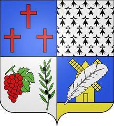 Keywords: Blason de la ville de Bezouce (30).svg blazon of en city of Bezouce Bezouce Gard Bezouce Gard fr Ecartelé au premier d'azur aux trois croisettes latines cousues de gueules mal ordonnées au deuxième d'hermine plain au troisième d'argent à la grappe de raisin de gueules feuillée d'une pièce de sinople senestrée d'un rameau d'olivier du même fruité de sable au quatrième d'azur au moulin à vent d'or sur une terrasse du même à la plume d'oie d'argent brochant en barre sur le tout it inquartato nel 1º d'azzurro a tre crocette latine cucite di rosso male ordinate; nel 2º d'armellino pieno; nel 3º d'argento al grappolo d'uva di rosso fogliato di un pezzo di verde sinistrato da un ramo d'olivo dello stesso fruttato di nero; nel 4º d'azzurro al mulino a vento d'oro su una terrazza dello stesso alla piuma d'oca d'argento attraversante in sbarra sul tutto spax89 Projet Blasons Own spax89 v -Blasons other versions Bezouce Contravention of no colour on colour Coats of arms of cities in Gard SVG coats of arms of France DEFAULTSORT Bezouce |