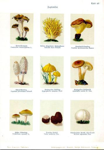 | Keywords: Bley, Botanisches Bilderbuch 48.jpg See below Botanisches Bilderbuch für Jung und Alt 1897 Franz Bley H Berdrow PD-old Latin 1 - Craterellus cornucopioides L Clavaria flava Schaeff Paxillus atrotomentosus Batsch - Coprinus porcellanus Schaeff Hygrophorus ceraceus Wulf Armillaria mellea Fl Dan - Tricholoma equestre L Tuber aestivum Vitt Bovista nigrescens Pers Deutsch 1 - Totentrompete Gelber Ziegenbart Hahnenkamm Samtfuß-Krämpling - Schopf-Tintling Wachsgelber Saftling Honiggelber Hallimasch - Echter Ritterling Deutsche Trüffel Schwärzlicher Bovist Eier-Bovist Bley Botanisches Bilderbuch |