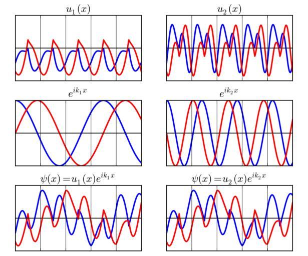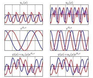 MAKE A MEME View Large Image BlochWaves1D.svg en A Bloch wave bottom can be broken up into the product of a periodic function top and a plane-wave center Blue is real part red is imaginary part The left side and right side represent the same Bloch wave broken up in two ...