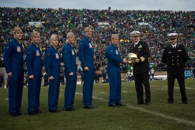 Keywords: Blue Angels 131102-N-SH953-140.jpg en Cmdr Tom Frosch commanding officer and flight leader of the U S Navy flight demonstration squadron the Blue Angels accepts a University of Notre Dame football helmet from Capt Michael Ryan commanding officer of the University of Notre Dame's Navy Recruit Officer Training Candidate ROTC unit during the National Collegiate Athletic Association NCAA football game between the U S Naval Academy and University of Notre Dame at Notre Dame stadium The helmet was a gift from Notre Dame Football Head Coach Brian Kelly The Blue Angels performed a flyover of the University of Notre Dame Stadium prior to kickoff U S Navy photo by Mass Communication Specialist 2nd Class Kathryn E Macdonald/Released 2013-11-02 Petty Officer 2nd Class Kathryn Macdonald https //www dvidshub net/image/1046694 131102-N-SH953-140 2013-11-04 23 12 PENSACOLA FL US PD-USGov-Military-Navy Notre Dame Stadium Blue Angels Images from DoD uploaded by Fæ |