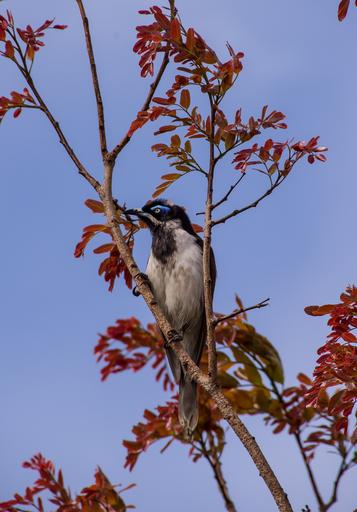 Keywords: blue faced honeyeater bird exotic honeyeater olive white blue wild feathers blue sky tree red leaves queensland australia