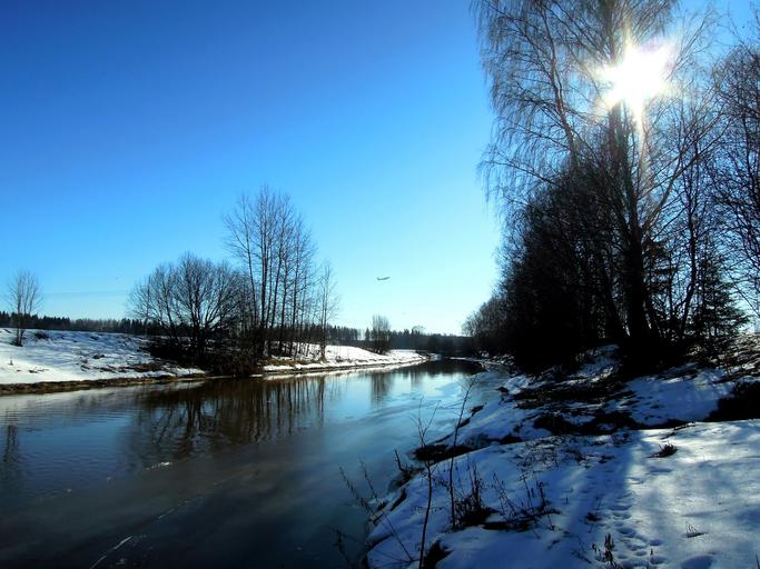 Keywords: blue sky sun aircraft blue sky landscape finnish vantaa countryside nature frost winter beach water field river vantaa river snowy