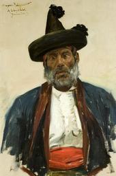 Keywords: BMVB- Chorrojumo-reis del gitanos-Miquel Carbonell Selva-720.jpg.tif Artwork Creator Miquel Carbonell Selva ca Retrat del gitano Mariano Fernández anomenat el Rei dels gitanos de l'alhambra amb barba grisa jaqueta blava camisa blanca amb xarreteres faixa roja i barret de pic negre amb garlanda de plomes i mocador al cap sota del barret Retrat de mig cos Mirada de front i molt bru de pell Fons blanc desdibuixat between 1854 1896 Oil on canvas Institution Biblioteca Museu Víctor Balaguer object history exhibition history credit line accession number place of creation Biblioteca Museu Víctor Balaguer-cooperation 100px jpg version PD-Art PD-old-100-1923 Uploaded with UploadWizard Paintings in the Biblioteca Museu Víctor Balaguer 19th-century art in Spain 19th-century portraits at bust length 19th-century paintings in Spain 19th-century painters from Spain Roma people in art Hats in art Realism in Spain Miquel Carbonell Selva |