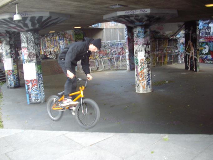 Keywords: 'BMX Biker' in London..JPG en A BMX Biker demonstrating his skills in a building garage alongside the river Thames estuary in London own Rudolph A furtado Sunday 30-5-2010 Freestyle BMX Cycling in London Queen Elizabeth Hall Undercroft