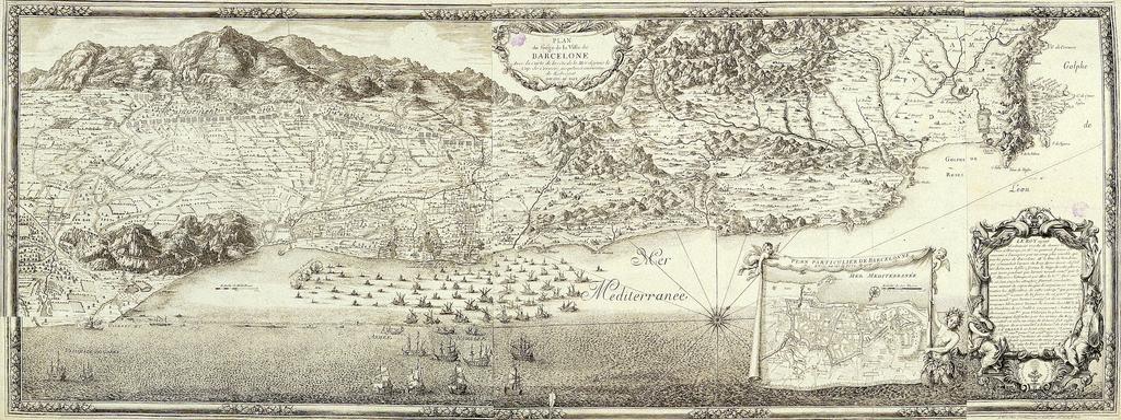 Keywords: BNE.Barcelona.planos.1698.jpg http //www bne es Biblioteca Nacional de España Lugar geogr Barcelona Sitios Planos 1698 Autores Secun Beaulieu Sébastien de Pontault de 1612-1674 Título Plan du Siège de la ville de Barcelonne Avec la Carte de la côte de la Mer depuis le Cap de Cervera jusqu'aux environs de Llobregat / S de Beaulieu Escala Escala ca 1 43 000 1000 Toises 4 5 cm Publicación A Paris Chez l'autheur rüe St Andrè des arts Porte de Bucy 1698 Descripción 1 mapa grab ; 45 x 119 cm Notas Pertenece a Les glorieuses conquestes de Louis le Grand S de Beaulieu Orientado con rosa con lis con el N al NE del plano - Rumbos - Cultivos y arbolado representados - Relieve por motes de perfil y sombreado En el mar representado combate naval Contenido Inserta Plan particulier de Barcelonne et de ses attaques - Ca 1 2 700 600 Thoises 4 3 cm - 14 x 19 cm - Orientado con rosa con lis con el N al SO del mapa Mapa en cortinaje sostenido por angelotes y sirena - En el ángulo inferior derecho explicación del sitio de Barcelona en cartela con figuras alegóricas PD-old Maps of the history of Barcelona 1698 Siege of Barcelona Maps showing 17th-century history 1698 maps 1698 in art Catalonia in the 1690s Old maps of cities in Catalonia Barcelona |