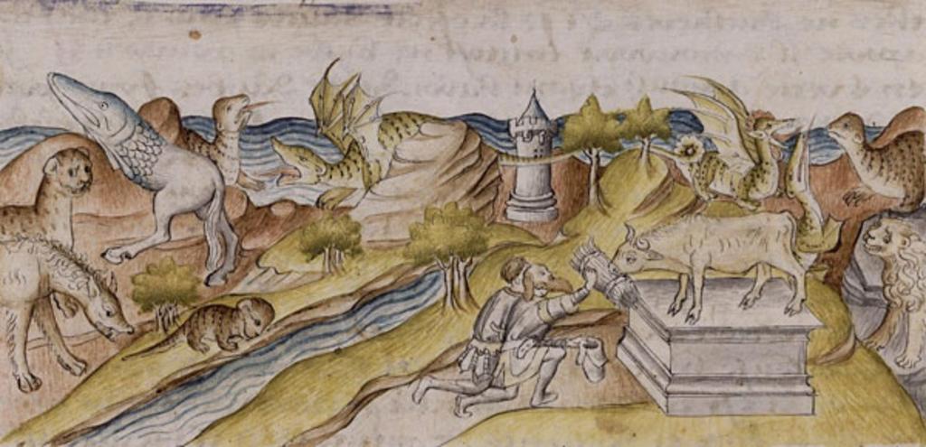 Keywords: BnF-fr1377-fol020v-Egypte.jpg fr Secrets de l'histoire naturelle BnF ms Français 1377 fol 20v En Égypte la Basse repairent et vivent deux périlleux monstres et se tiennent voulentiers sur les rivages de la mer qui sont moult crains et doubtez des habitans du païs dont les uns ont nom hippotaures et les autres ont nom cocodrilles Mais en la Haute qui est vers Orient repairent moult de bestes sauvages et venimeuses comme leons liepars parides trigides et basiliques dragons serpens et aspics qui sont plaines de très périlleux et mortel venin inscription Voir aussi Mandragore http //mandragore bnf fr/jsp/feuilleterNoticesImage jsp numero 15 id 40249 idPere 5 que identifie catoblepas en Secrets de l'histoire naturelle Manuscript Français 1377 fol 20v Egypt and its fauna Inscription mentions hippotaures and cocodrilles parides trigides tigers difficult to identify in picture On the left are a leopard hyena-like animal a cub of an animal or an otter-like animal ; and a hybrid with head of a pikefish and a horse's body a reverse hippocampus An animal looking like a banded mongoose occurs twice basilisks Several dragons Lion at far right Center ox on a pedestal fed a sheaf of grass by two men Mandragore lists catoblepas as keywordhttp //mandragore bnf fr/jsp/feuilleterNoticesImage jsp numero 15 id 40249 idPere 5 An otter is the suggestion in the CORSAIR catalog for an equivalent scene in the Morgan Library ms http //corsair themorgan org/cgi-bin/Pwebrecon cgi v1 15 ti 1 15 Search 5FArg 22ms 20m 2E461 22 20ica Search 5FCode GKEY 5E CNT 50 PID cilrGtPzEZXtVS1je0GVKrPQj2qs SEQ 20160814230600 SID 1 ~ 1428 citation http //expositions bnf fr/bestiaire/grand/z_11 htm La faune d'Égypte Bibliothèque national Exposition Bestiaire du Moyen Âge Français 1377 fol 20v maître de Marguerite d'Orléans other versions Custom license marker 2016 08 15 PD-old France Dragons Secrets de l'histoire naturelle - BnF fr 1377 |