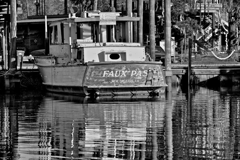 Keywords: boat dock port old wooden trawler recreation travel pleasure boat river reflections water marina black and white