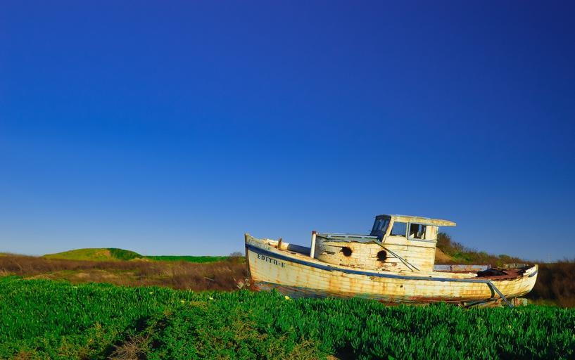 Keywords: boat vintage oldschool rust grass fields blue sky