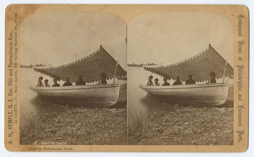 Keywords: stereographs philadelphia fairmount park fairmountpark lakes boats a. h. hemple ahhemple monochrome Shows two women and four men sitting in a covered boat resting at the edge of a lake in Fairmount Park, Philadelphia,1876. Rocks, weeds and fallen leaves form the shore line. Accession number: P.2011.47.856 Shows two women and four men sitting in a covered boat resting at the edge of a lake in Fairmount Park, Philadelphia,1876. Rocks, weeds and fallen leaves form the shore line. Accession number: P.2011.47.856 |