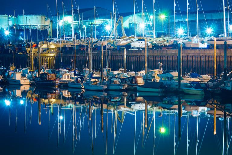 Keywords: boats reflection night water sea blue harbor ocean transport outdoors boating calm sailboat moored nautical city lights