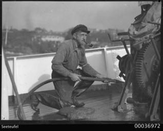 Keywords: hood collection hoodcollection samuel j hood collection samueljhoodcollection sam hood samhood samuel j hood studio collection samueljhoodstudiocollection hood count felix graf von luckner countfelixgrafvonluckner count von luckner countvonluckner von luckner vonluckner seeteufel sydney sydney harbour sydneyharbour neutral bay neutralbay kirribilli kurraba point kurrabapoint auxiliary cruiser auxiliarycruiser schooner german crew boatswain karl muller karlmuller blackandwhite monochrome black and white This photograph depicts the boatswain of SEETEUFEL, Karl Muller, smoking a pipe and hosing the vessel's deck, during Count Felix Graf von Luckner's visit to Sydney in May 1938. According to the secret files kept on the von Luckners by the Commonwealth Investigation Branch (CIB), Muller was: ‘afraid to go ashore because he cannot resist the city hotels and as he is 62 years of age cannot stand up to hard drinking.' These files are held within the National Archives of Australia. For more information on Count von Luckner's visit see our blog post 'Espionage and paranoia: The Sea Devil tours Australia'. This photo is part of the Australian National Maritime Museum’s Samuel J. Hood Studio collection. Sam Hood (1872-1953) was a Sydney photographer with a passion for ships. His 60-year career spanned the romantic age of sail and two world wars. The photos in the collection were taken mainly in Sydney and Newcastle during the first half of the 20th century. The ANMM undertakes research and accepts public comments that enhance the information we hold about images in our collection. This record has been updated accordingly. Photographer: Samuel J. Hood Studio Collection Object no. 00036972 This photograph depicts the boatswain of SEETEUFEL, Karl Muller, smoking a pipe and hosing the vessel's deck, during Count Felix Graf von Luckner's visit to Sydney in May 1938. According to the secret files kept on the von Luckners by the Commonwealth Investigation Branch (CIB), Muller was: ‘afraid to go ashore because he cannot resist the city hotels and as he is 62 years of age cannot stand up to hard drinking.' These files are held within the National Archives of Australia. For more information on Count von Luckner's visit see our blog post 'Espionage and paranoia: The Sea Devil tours Australia'. This photo is part of the Australian National Maritime Museum’s Samuel J. Hood Studio collection. Sam Hood (1872-1953) was a Sydney photographer with a passion for ships. His 60-year career spanned the romantic age of sail and two world wars. The photos in the collection were taken mainly in Sydney and Newcastle during the first half of the 20th century. The ANMM undertakes research and accepts public comments that enhance the information we hold about images in our collection. This record has been updated accordingly. Photographer: Samuel J. Hood Studio Collection Object no. 00036972 |