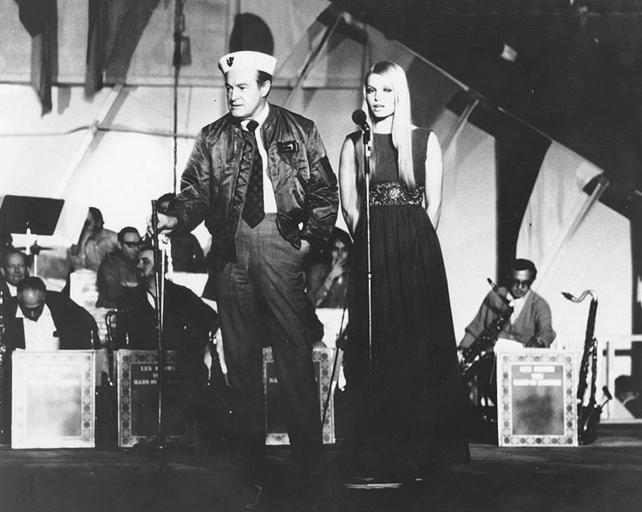 | Keywords: Bob Hope with Eva Rueber-Staier during USO tour on USS Saratoga (CVA-60) 1969.jpg  The entertainer Bob Hope on stage with Miss World 1969 Eva Rueber-Staier during a Christmas show for servicemen held on board the U S Navy aircraft carrier USS Saratoga CVA-60 off Gaeta in Formia Bay Italy 22 December 1969 <br>The Bob Hope USO Tour performed at 1400 hrs aboard Saratoga with Eva Rueber-Staier Hollywood stars Connie Stevens Suzanne Charny the Golddiggers Ellen Farley and Les Brown and his Band of Renown Over 6 000 Sixth Fleet sailors from Saratoga USS Little Rock CLG-4 five destroyers and a fleet oiler attended the event held in the carrier's hanger bay Official U S Navy photo http //www history navy mil/photos/images/k80000/k80498c htm K-80498 from the U S Navy http //www history navy mil Naval History and Heritage Command 1969-12-22 USN PD-USGov-Military-Navy see at this http //www history navy mil/branches/org11-2 htm site all Pictures in the Online Library of Naval Historical Center are public domain Bob Hope and the USO Miss World 1969 Aboard USS Saratoga CV-60 |