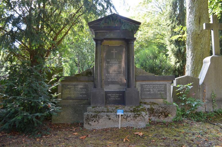 Keywords: Bockenheim, Neuer Friedhof Grab 8a Rh 19 - 8-11 Riemerschmidt.JPG de Bockenheim Neuer Friedhof Grab 8a Rh 19 - 8-11 Familiengrabstätte Riemerschmid Fabrikbesitzer Ludwig Riemerschmid 28 05 1861 + 06 11 1934 73 Jahre Louise Riemerschmid geborene Siemon 01 11 1861 + 23 07 1905 44 Jahre Ehefrau Agnes Siemon geborene Leng 01 11 1833 + 25 04 1909 76 Jahre Schwiegermutter Lina Riemerschmid geborene Siemon 14 02 1866 + 22 04 1928 62 Jahre Schwester und zweite Ehefrau Ludwigs Ludwig Riemerschmid 14 08 1891 + 28 07 1961 70 Jahre Sohn Luise Riemerschmid geborene Stein 25 12 1895 + 08 09 1973 78 Jahre Der Grundstein für den beachtlichen Wohlstand der Familie Riemerschmid bildete die von Anton Riemerschmid 1835 gegründete Weinbrennerei Essig- und Likörfabrik München Seit 1996 gehört sie der Underberg-Gruppe Nach dem Tod Anton Riemerschmids 1802-1878 traten dessen Söhne Eduard Franz 1835-1894 und Heinrich Riemerschmid 1836-1882 an die Spitze des Unternehmens Eduard Franz Riemerschmid 1835-1894 und Amalie Riemerschmid geborene Weishaupt 1839-1897 hatten neun Kinder Sie waren auch die Eltern von Ludwig Riemerschmid 28 05 1861 + 06 11 1934 Ludwigs Geschwister waren teilweise bekannte Persönlicheiten So z B Dr Carl Riemerschmid Er übernahm 1905 die Geschäftsführung der Weinbrennerei und Likörfabrik Anton Riemerschmid München er selbst; Ludwig Riemerschmid 1861-1934 Frankfurt-Bockenheim Arthur Riemerschmid 1864-1929 Ökonom und Landwirt Eduard Riemerschmid 1866-1935 Maler Architekt; Ehefrau Thusnelda Riemerschmid 1874 Oberaudorf-1935 München ; Tochter Marianne Rümmler-Riemerschmid 1897 München + N N ; Ehefrau von Ernst Keller 1 Ehe geschieden Ehefrau von Wolf Rümmler 2 Ehe Richard Riemerschmid 1868-1957 ; Maler Entwerfer Architekt Kunstprofessor und ein bedeutender Künstler des Jugendstils in Deutschland Elisabeth Riemerschmid 1871- 1953 ; Ehefrau von Ludwig Knözinger Frieda Riemerschmid 1878-1917 spätere Schmidt-Hellerau Sie heiratete 1910 den Gründer der Deutschen Werkstätten für Handwerkskunst Karl Schmidt-Hellerau 1873-1948 Unternehmer Tischler den sog Holz-Goethe Sie war seine zweite Ehefrau von insgesamt drei Ehefrauen Margarethe Riemerschmid verheiratet mit Reinhard Fieser 1867 Wertheim-1960 Gauting 22 Jahre Oberbürgermeister der Stadt Baden-Baden von 1907-1929 Ehrenbürger der Stadt Baden-Baden seit 10 12 1929 2015-08-21 own Karsten Ratzke other versions cc-zero Gravestones at Neuer Friedhof Frankfurt-Bockenheim Cultural heritage monuments at Neuer Friedhof Frankfurt-Bockenheim Uploaded with UploadWizard Gravestones by F Hofmeister |
