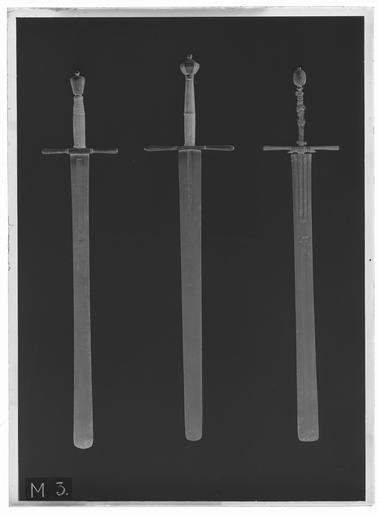 Keywords: Bödelssvärd, Weilm Klein, Solingen, 1610-ca 1630 - Livrustkammaren - 17910-negative.tif Fäste av stål Sexsidig slät knapp med mittpartiets sidor platt fasade tämligen hög nitknapp Åttsidiga raka parerstänger avsmalnande mot krysset och med rundade ytterändar <br/>Åttsidig kavel lindad med brunt fårskinn runt mitten en utstående list uppbyggd under skinnklädseln <br/><br/>Tvåeggad bred klinga med tvärskuren något rundad ytterände Utmed starka delen hålkäl vari inslaget i koppar på ena sidan +WEILM+ på andra sida +KLEIN+ Ovanför namnen inlagt i koppar på ena sidan ett hjul under ett halvt hjorthorn på andra sidan en galge likaledes under ett halvt hjorthorn original caption ca other date - 1610 1630 size mm 1073 size mm 812 klinga size mm 63 klinga g 2090 LRK Axel Oxenstierna af Södermöre WEILM KLEIN anv b2 - blankvapen - klinga; Wilhelm Klein place of origin Solingen original filename LN_B05012_007892 40163 inventory number LRK 3617 17910 CC0 Bödelssvärd Weilm Klein Solingen 1610-ca 1630 - Livrustkammaren - 17910 tif |