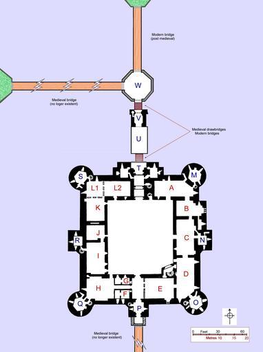 | Keywords: Bodiam Castle ground plan.jpg Postern tower Q South-west tower R West tower S North-west tower and prison T Gatehouse with guard rooms to left and right U Inner causeway V Outer Barbican W Outer causeway Other sources used to create this plan include cite web Alison Stones IMAGES OF MEDIEVAL ART AND ARCHITECTURE BRITAIN ENGLAND BODIAM CASTLE http //www medart pitt edu/image/england/bodiam/mainbodiam html http //libilybod blogspot com/ http //www hist umn edu/hist3611/moved/protected/castles2/images/bodiam2 jpg http //www piclund com/bodiam-castle-plan html 2011-09-25 Developed from Archaeological Journal 1905 vol 62 page 179 The Council of the Royal Archaeological Institute PD-old PD-US Bodiam Castle in art Uploaded with UploadWizard Floor plans of the United Kingdom |