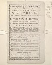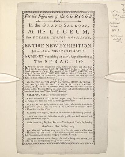 Keywords: Bodleian Libraries, Advertisement of Lyceum Theatre announcing A cabinet.jpg Advertisement of Lyceum Theatre announcing A cabinet; Ladies and gentlemen may have their portraits taken in either wax or miniature by this artist Should the portraits not be thought the most striking and correct likenesses he will not expect any thing for his trouble See advertisement for same event Waxworks 1 43 ; Cabinet; Emperor of Germany Empress of Russia the French King and Queen; the Kings of Spain Prussia Portugal and Naples and the Stadtholder with their repective families ; Sleeping Venus; Most beautiful Venus in full length; Voltaire that justly admired French genius; Advertisement of Lyceum Theatre announcing A cabinet single sheet; 319 x 195 mm exhibition history For the inspection of the curious In the grand salloon at the Lyceum near Exeter Change in the Strand is an entire exhibition just arrived from Constantinople a cabinet containing an exact representation of the seraglio most curiously moulded in wax by Mr Silvestre Allegro identifier 20030509/12 54 52 hm ; t207713 object history object type Licensed-PD-Art PD-old-100 cc-by-4 0 place of creation place of discovery http //digital bodleian ox ac uk/inquire/p//87dc20bc-4db4-493e-8045-46243463da75 Digital Bodleian Template John Johnson Advertisement of Lyceum Theatre announcing A cabinet Uploaded with GWToolset Bodleian Libraries Advertisement of Lyceum Theatre announcing A cabinet http //iiif bodleian ox ac uk/iiif/image/87dc20bc-4db4-493e-8045-46243463da75/full/ 1000 1000/0/default jpg Files uploaded by the Bodleian Libraries' Wikimedian In Residence Cabinets of curiosities Royal houses Kings Harem Venus deities Writers Waxworks plastic arts Voltaire 1694-1778 |