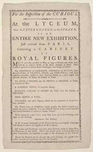 | Keywords: Bodleian Libraries, Advertisement of Lyceum Theatre (London, England), 1785, announcing A cabinet of royal figures. Most curiously moulded in wax.jpg Advertisement of Lyceum Theatre London England 1785 announcing A cabinet of royal figures Most curiously moulded in wax; Ladies and gentlemen may have their portraits taken in either wax or miniature by this artist Should the portraits not be thought the most striking and correct likenesses he will not expect any thing for his trouble ; Cabinet of royal figures Most curiously moulded in wax; Emperor of Germany Empress of Russia their Majesties of France Spain and Portugal with their respective families ; King of Prussia and the Prince of Orange at table in Council of War; Sleeping Venus; Hunting parties of Henry the IVth with the family of Meunier; Dido Queen of Tyre; Voltaire and other figures ; For the inspection of the curious At the Lyceum near Exeter Change in the Strand is an entire new exhibition just arrived from Paris containing a cabinet of royal figures Most curiously moulded in wax ; Lyceum Theatre Westminster London England ; Advertisement of Lyceum Theatre London England 1785 announcing A cabinet of royal figures Most curiously moulded in wax single sheet; 310 x 194 mm exhibition history 003682; t154030 object history object type Licensed-PD-Art PD-old-100 cc-by-4 0 place of creation place of discovery http //digital bodleian ox ac uk/inquire/p//b5e741be-d893-4e3c-ba64-7af87d19bb0f Digital Bodleian Template John Johnson Advertisement of Lyceum Theatre London England 1785 announcing A cabinet of royal figures Most curiously moulded in wax Uploaded with GWToolset Bodleian Libraries Advertisement of Lyceum Theatre London England 1785 announcing A cabinet of royal figures Most curiously moulded in wax http //iiif bodleian ox ac uk/iiif/image/b5e741be-d893-4e3c-ba64-7af87d19bb0f/full/ 1000 1000/0/default jpg Files uploaded by the Bodleian Libraries' Wikimedian In Residence Lyceum Theatre London |