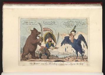 Keywords: Bodleian Libraries, The bear and the monkey preparing to attack the turkey.jpg Satire on the Napoleonic wars British political cartoon ; Napoleon with a monkey's legs leads the Russian bear against a weakened Turkey ; Not in BMC Similar to BMC 10775 Publisher's number 5 Imprint or other statement obliterated with black ink at the lower edge of the image just above the imprint 238 x 345 sheet ; 223 x 325 image and text mm; etching exhibition history Source filename politi004-acn-0001-0 object history object type Licensed-PD-Art PD-old-100 cc-by-4 0 place of creation London England Thomas Tegg place of discovery http //digital bodleian ox ac uk/inquire/p//da3a4f6d-b20c-4d7e-96f7-64e5f7915416 Digital Bodleian Template Bodleian Libraries The bear and the monkey preparing to attack the turkey Uploaded with GWToolset Bodleian Libraries The bear and the monkey preparing to attack the turkey http //iiif bodleian ox ac uk/iiif/image/da3a4f6d-b20c-4d7e-96f7-64e5f7915416/full/ 1000 1000/0/default jpg Files uploaded by the Bodleian Libraries' Wikimedian In Residence Napoleonic Wars Treaty of Tilsit Caricatures of Napoleon I of France National stereotypes -- Turkey A correct plan and elevation of the famous French raft constructed on purpose for the invasion of England and intended to carry 30 000 men ammunition stores c c Animals in art Curzon Collection |