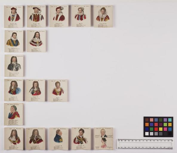 | Keywords: Bodleian Libraries, Cards depicting monarchs- lacking title page.jpg Cards depicting monarchs lacking box and title page ; Norman line William the Conqueror; Norman line William Rufus; Norman line Henry I; Norman Line Stephen; Line of Plantagenet Henry II; Line of Plantagenet Richard I; Line of Plantagenet John; Line of Plangagenet Henry III; Line of Plantagenet Edward I; Line of Plantagenet Edward II; Line of Plantagenet Edward III; Line of Plantagenet Richard II; Line of Lancaster Henry IV; Line of Lancaster Henry V; Line of Lancaster Henry VI; Line of York Edward IV; Line of York Edward V; Line of York Richard III; Line of the Tudors Henry VII; Line of the Tudors Henry VIII; Line of the Tudors Edward VI; Line of the Tudors Mary; Line of the Tudors Elizabeth; Line of the Stuarts James I Union of the two kingdoms; Line of the Stuarts Charles I; Commonwealth Oliver Cromwell; Line of the Stuarts Charles II; Line of the Stuarts James II; Line of the Stuarts Anne; House of Orange William Mary; Line of Brunswick George I; Line of Brunswick George II; Line of Brunswick George III; Line of Brunswick George IV; Line of Brunswick William IV Victoria; Image 2 single sheets 35p ; 62 x 55 mm exhibition history Allegro identifier 20030919/10 57 36 jl object history object type Licensed-PD-Art PD-old-100 cc-by-4 0 place of creation place of discovery http //digital bodleian ox ac uk/inquire/p//c52514b9-14a6-482d-9782-d1b80c9ea92a Digital Bodleian Template John Johnson Cards depicting monarchs lacking title page Uploaded with GWToolset Bodleian Libraries Cards depicting monarchs lacking title page http //iiif bodleian ox ac uk/iiif/image/cef175b5-6cea-4f56-8a95-b1d04c46badd/full/ 1000 1000/0/default jpg Files uploaded by the Bodleian Libraries' Wikimedian In Residence Dedicated deck card games History of Great Britain William I King of England 1027 or 8-1087 William II King of England 1056 -1100 Henry I King of England 1068-1135 Stephen King of England 1097 -1154 Henry II King of England 1133-1189 Richard I King of England 1157-1199 Henry III King of England 1207-1272 Edward I King of England 1239-1307 Edward II King of England 1284-1327 Edward III King of England 1312-1377 Richard II King of England 1367-1400 Henry IV King of England 1367-1413 Henry V King of England 1387-1422 aHenry VI King of England 1421-1471 Edward IV King of England 1442-1483 Edward V King of England 1470-1483 Richard III King of England 1452-1485 Henry VII King of England 1457-1509 Henry VIII King of England 1491-1547 Edward VI King of England 1537-1553 Mary I Queen of England 1516-1558 Elizabeth I Queen of England 1533-1603 James I King of England 1566-1625 Charles I King of England 1600-1649 Cromwell Oliver 1599-1658 Charles II King of England 1630-1685 James II King of England 1633-1701 Anne Queen of Great Britain 1665-1714 William III King of England 1650-1702 George I King of Great Britain 1660-1727 George II King of Great Britain 1683-1760 George III King of Great Britain 1738-1820 George IV King of Great Britain 1762-1830 William IV King of Great Britain 1765-1837 Victoria Queen of Great Britain 1819-1901 John King of England --1167-1216 Mary Queen consort of William III --1661-1694 |