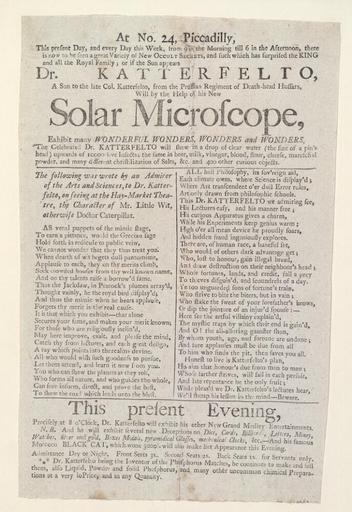 Keywords: Bodleian Libraries, Handbill announcing Wonderful wonders, wonders and wonders.jpg Handbill announcing Wonderful wonders wonders and wonders; The celebrated Dr Katterfelto will shew in a drop of clear water the size of a pin's head upwards of 10000 live insects; the same in beer milk vinegar blood flour cheese mareschal powder and many different christilization of salts c and 400 other curious objects Has vese by an admirer of the Arts and Sciences ; Wonderful wonders wonders and wonders; New grand medley entertainments; Deceptions on dice cards billiards letters money watches silver and gold boxes medals pyramidical glasses mechanical clocks c ; At no 24 Piccadilly this present day and every day this week from 9 in the morning till 6 in the afternoon there is now to be seen a great variety of new occult sciences or if the sun appears Dr Katterfelto will by the help of his new solar microscope exhibit many wonderful wonders ; Katterfelto Gustavus d 1799; Handbill announcing Wonderful wonders wonders and wonders single sheet; 275 x 177 mm exhibition history As venal puppets of the mimic stage first line of verse 003232; t160708 object history object type Licensed-PD-Art PD-old-100 cc-by-4 0 place of creation place of discovery http //digital bodleian ox ac uk/inquire/p//89164425-41f6-4de9-b800-313243bf1708 Digital Bodleian Template John Johnson Handbill announcing Wonderful wonders wonders and wonders Uploaded with GWToolset Bodleian Libraries Handbill announcing Wonderful wonders wonders and wonders http //iiif bodleian ox ac uk/iiif/image/89164425-41f6-4de9-b800-313243bf1708/full/ 1000 1000/0/default jpg Files uploaded by the Bodleian Libraries' Wikimedian In Residence Microscopes Solar System Black cats Piccadilly London England microscope solar