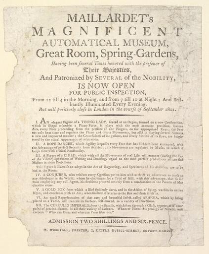 | Keywords: Bodleian Libraries, Handbill for the Great Room, Spring Gardens, 1800, announcing Maillardet's Magnificent Automatical Museum.jpg Handbill for the Great Room Spring Gardens 1800 announcing Maillardet's Magnificent Automatical Museum; announcement of closure Torn Some fragments missing with no loss of text; Date on mount c 1798 ; Maillardet's Magnificent Automatical Museum; Elegant figure of a young lady seated at an organ; Rope dancer; Figure of a child; Conjurer; Gold box from which a bird suddenly darts; Exact representation of that rare and beautiful insect called Aranea; Curculio imperialis from the Brazils; Maillardet's Magnificent Automatical Museum Great Room Spring Gardens having been several times honored with the presence of Their Majesties and patronized by several nobility is now open for public inspection But will positively close in London in the course of September 1801; Handbill for the Great Room Spring Gardens 1800 announcing Maillardet's Magnificent Automatical Museum single sheet; 230 x 187 mm exhibition history 003368; t188708 object history object type Licensed-PD-Art PD-old-100 cc-by-4 0 place of creation London England Woodfall T place of discovery http //digital bodleian ox ac uk/inquire/p//b8c01840-3db8-436e-92ae-6972dd4e74a0 Digital Bodleian Template John Johnson Handbill for the Great Room Spring Gardens 1800 announcing Maillardet's Magnificent Automatical Museum Uploaded with GWToolset Bodleian Libraries Handbill for the Great Room Spring Gardens 1800 announcing Maillardet's Magnificent Automatical Museum http //iiif bodleian ox ac uk/iiif/image/b8c01840-3db8-436e-92ae-6972dd4e74a0/full/ 1000 1000/0/default jpg Files uploaded by the Bodleian Libraries' Wikimedian In Residence Robots Musical instruments Model building |