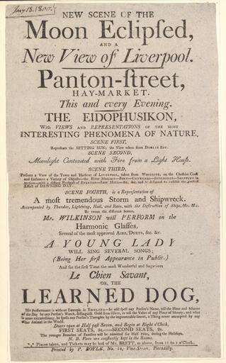 | Keywords: Bodleian Libraries, Handbill of Panton-street, Haymarket, Jany. 18. 1800, announcing The eidophusikon.jpg Handbill of Panton-street Haymarket Jany 18 1800 announcing The eidophusikon; Jany 18 1800 manuscript ; Eidophusikon; Airs duets c c on the harmonic glasses; Several songs; Handbill of Panton-street Haymarket Jany 18 1800 announcing The eidophusikon single sheet; 308 x 184 mm exhibition history New scene of the moon eclipsed and a new view of Liverpool Allegro identifier 20030501/15 28 01 jl object history object type Licensed-PD-Art PD-old-100 cc-by-4 0 place of creation London England Boyle P place of discovery http //digital bodleian ox ac uk/inquire/p//8cc74d28-f260-4bbc-ba1b-611ee5b45ce8 Digital Bodleian Template John Johnson Handbill of Panton-street Haymarket Jany 18 1800 announcing The eidophusikon Uploaded with GWToolset Bodleian Libraries Handbill of Panton-street Haymarket Jany 18 1800 announcing The eidophusikon http //iiif bodleian ox ac uk/iiif/image/8cc74d28-f260-4bbc-ba1b-611ee5b45ce8/full/ 1000 1000/0/default jpg Files uploaded by the Bodleian Libraries' Wikimedian In Residence Women Musical instruments Glass harmonica Liverpool England eidophusikon Musicians trained animals |