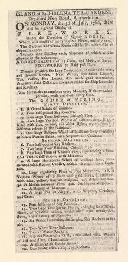 | Keywords: Bodleian Libraries, Island of St. Helena tea-gardens.jpg Newscutting relating to Island of St Helena tea-gardens Monday the 3d of July 1780 announcing A grand display of fireworks; St Helena tea-gardens; Grand display of fireworks; Grand salute of 21 guns and music; Island of St Helena tea-gardens single sheet; 164 x 71 mm exhibition history On Monday the 3d of July 1780 there will be a grand display of fireworks Allegro identifier 20030605/12 38 14 hm object history object type Licensed-PD-Art PD-old-100 cc-by-4 0 place of creation place of discovery http //digital bodleian ox ac uk/inquire/p//9dba832b-b5a1-4caf-9d2e-1b49ae1920b0 Digital Bodleian Template John Johnson Island of St Helena tea-gardens Uploaded with GWToolset Bodleian Libraries Island of St Helena tea-gardens http //iiif bodleian ox ac uk/iiif/image/9dba832b-b5a1-4caf-9d2e-1b49ae1920b0/full/ 1000 1000/0/default jpg Files uploaded by the Bodleian Libraries' Wikimedian In Residence Fireworks Ordnance Music Clippings |