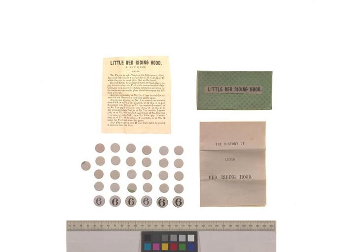 | Keywords: Bodleian Libraries, Little Red Riding Hood. A new game 50.jpg Game entitled Little Red Riding Hood A new game; separate box has narrative 8 pp rules two alphabet strips A B C and D E F teetotum spinner counters 22 blank 3 with green splashes of colour 6 6s; Image 2 single sheet box 8p rules counters spinner teetotum; 285 x 267 board mm; 55 x 108 x 13 box mm exhibition history Allegro identifier 20030929/14 29 33 jl object history object type Licensed-PD-Art PD-old-100 cc-by-4 0 place of creation London England E C Bennett place of discovery http //digital bodleian ox ac uk/inquire/p//67c4a487-2368-458d-87ed-a1bd1d309076 Digital Bodleian Template John Johnson Little Red Riding Hood A new game Uploaded with GWToolset Bodleian Libraries Little Red Riding Hood A new game_50 http //iiif bodleian ox ac uk/iiif/image/3cd5f6d9-6c76-47af-84a4-0718c185ba52/full/ 1000 1000/0/default jpg Files uploaded by the Bodleian Libraries' Wikimedian In Residence Board games Wolves Little Red Riding Hood |