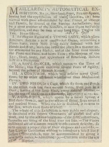 | Keywords: Bodleian Libraries, Maillardet's automatical exhibition.jpg Newscutting relating Maillardet's automatical exhibition; Elegant figure of a young lady which plays fourteen airs on a new constructed organ resembling a Piano-Forte; Rope-dancer; Conjuror; Two birds in a cage; Gold box with mechanical bird; Maillardet's automatical exhibition single sheet; 101 x 70 mm exhibition history Allegro identifier 20030605/11 16 07 hm object history object type Licensed-PD-Art PD-old-100 cc-by-4 0 place of creation place of discovery http //digital bodleian ox ac uk/inquire/p//d9e4c514-3a84-4fc0-8e3e-6ceb3e9a26d2 Digital Bodleian Template John Johnson Maillardet's automatical exhibition Uploaded with GWToolset Bodleian Libraries Maillardet's automatical exhibition http //iiif bodleian ox ac uk/iiif/image/d9e4c514-3a84-4fc0-8e3e-6ceb3e9a26d2/full/ 1000 1000/0/default jpg Files uploaded by the Bodleian Libraries' Wikimedian In Residence Mechanical toys Exhibitions Musical instruments Kings Clippings automata |