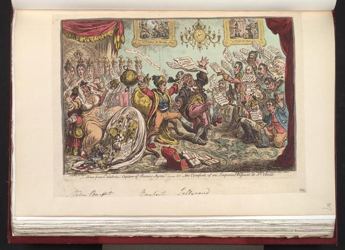 | Keywords: Bodleian Libraries, News from Calabria Capture of Buenos Ayres ie - the comforts of an imperial dejeuné at St Clouds.jpg accession number Curzon b 4 147 Creator James Gillray artist Satire on the Napoleonic wars British political cartoon ; A comment on the Calabrian uprising in Sicily and the stirrings of revolt against Napoleonic power in the rest of Europe including France itself Napoleon enraged by the bad news in The Moniteur and in dispatches brought by Talleyrand kicks and bludgeons the minister The paintings on the wall ostensibly by David depict earlier French victories as won by gold Napoleon handing over sacks of money at Marengo and Ulm ; MS annotations in bottom margin identifying Madam Bonaparte; Bonaparte; Tallyrand 278 x 377 sheet ; 240 x 344 image and text mm; etching exhibition history Source filename politi004-acf-0001-0 object history object type Licensed-PD-Art PD-old-100 cc-by-4 0 place of creation London England Hannah Humphrey place of discovery http //digital bodleian ox ac uk/inquire/p//a884b0d3-08dd-48b6-a9d3-e82c9abf931e Digital Bodleian Template Bodleian Libraries News from Calabria Capture of Buenos Ayres --- i e --- the comforts of an imperial dejeuné at St Clouds Uploaded with GWToolset Bodleian Libraries News from Calabria Capture of Buenos Ayres ie the comforts of an imperial dejeuné at St Clouds http //iiif bodleian ox ac uk/iiif/image/a884b0d3-08dd-48b6-a9d3-e82c9abf931e/full/ 1000 1000/0/default jpg Files uploaded by the Bodleian Libraries' Wikimedian In Residence Elisa Baciocchi Caroline Bonaparte Pauline Bonaparte Joséphine de Beauharnais Caricatures of Napoleon I of France Charles-Maurice de Talleyrand History of Spain National stereotypes -- Sweden National stereotypes -- Switzerland National stereotypes -- Austria National stereotypes -- Prussia Personifications of Holland National stereotypes -- Turkey Napoleonic Wars Newspapers Marengo Battle of Marengo Italy 1800 Ulm Germany --History--Capitulation 1805 David Jacques Louis 1748-1825 Curzon Collection |