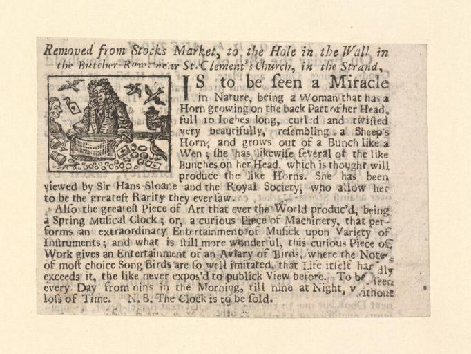 | Keywords: Bodleian Libraries, Newscutting relating to Hole in the wall in the Butcher-Row announcing a Woman with horn growing.jpg Newscutting relating to Hole in the wall in the Butcher-Row announcing a Woman with horn growing; Woman with horn growing; Spring musical clock; Newscutting relating to Hole in the wall in the Butcher-Row announcing a Woman with horn growing single sheet; 59 x 85 mm exhibition history Removed from Stocks Market to the hole in the wall in the Butcher-Row near St Clement's Church in the Strand is to be seen a miracle in nature being a woman that has a horn growing on the back part of her head Allegro identifier 20030616/14 59 51 hm object history object type Licensed-PD-Art PD-old-100 cc-by-4 0 place of creation place of discovery http //digital bodleian ox ac uk/inquire/p//5be7fa35-a4e6-44c2-a04b-b9b1f753d45e Digital Bodleian Template John Johnson Newscutting relating to Hole in the wall in the Butcher-Row announcing a Woman with horn growing Uploaded with GWToolset Bodleian Libraries Newscutting relating to Hole in the wall in the Butcher-Row announcing a Woman with horn growing http //iiif bodleian ox ac uk/iiif/image/5be7fa35-a4e6-44c2-a04b-b9b1f753d45e/full/ 1000 1000/0/default jpg Files uploaded by the Bodleian Libraries' Wikimedian In Residence Abnormalities Human Women Horns Mechanical toys Musical instruments Curiosities Exhibitions Clippings Wigs Clothing Equipment Freaks |