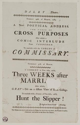 | Keywords: Bodleian Libraries, Playbill of Dalby Theatre, Tuesday 29th. of March, Thursday 31st. of March 1785, announcing Cross purposes &c..jpg Playbill of Dalby Theatre Tuesday 29th of March Thursday 31st of March 1785 announcing Cross purposes c ; bill has plays for 29th and 31st of March Badley creased and torn with hole affecting word 'marriage'; Cross purposes; Comic interlude; Commissary; Three weeks after marriage; Gray's ode on a distant view of Eton College; Hunt the slipper; Playbill of Dalby Theatre Tuesday 29th of March Thursday 31st of March 1785 announcing Cross purposes c single sheet; 321 x 200 mm exhibition history New poetical address 011087 object history object type Licensed-PD-Art PD-old-100 cc-by-4 0 place of creation s l England s n place of discovery http //digital bodleian ox ac uk/inquire/p//158375ef-49f5-4458-9b31-38307f1c6f5d Digital Bodleian Template John Johnson Playbill of Dalby Theatre Tuesday 29th of March Thursday 31st of March 1785 announcing Cross purposes c Uploaded with GWToolset Bodleian Libraries Playbill of Dalby Theatre Tuesday 29th of March Thursday 31st of March 1785 announcing Cross purposes c http //iiif bodleian ox ac uk/iiif/image/158375ef-49f5-4458-9b31-38307f1c6f5d/full/ 1000 1000/0/default jpg Files uploaded by the Bodleian Libraries' Wikimedian In Residence Theater England--Dalby--History--18th century Playbills farce |