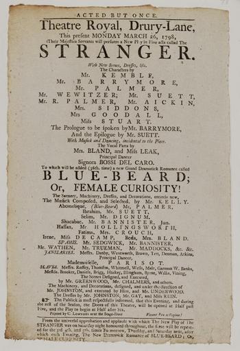 Keywords: Bodleian Libraries, Playbill of Drury Lane Theatre, Monday March 26, 1798, announcing The stranger &c..jpg Playbill of Drury Lane Theatre Monday March 26 1798 announcing The stranger c ; damaged at bottom edge; Stranger; Blue-beard; or Female curiosity ; Playbill of Drury Lane Theatre Monday March 26 1798 announcing The stranger c single sheet; 300 x 200 mm exhibition history Acted but once Allegro identifier 20011017/12 34 04 ah object history object type Licensed-PD-Art PD-old-100 cc-by-4 0 place of creation London England Lowndes place of discovery http //digital bodleian ox ac uk/inquire/p//574f2242-a441-4e0a-8c5b-e814f91d4295 Digital Bodleian Template John Johnson Playbill of Drury Lane Theatre Monday March 26 1798 announcing The stranger c Uploaded with GWToolset Bodleian Libraries Playbill of Drury Lane Theatre Monday March 26 1798 announcing The stranger c http //iiif bodleian ox ac uk/iiif/image/574f2242-a441-4e0a-8c5b-e814f91d4295/full/ 1000 1000/0/default jpg Files uploaded by the Bodleian Libraries' Wikimedian In Residence Playbills Machines |