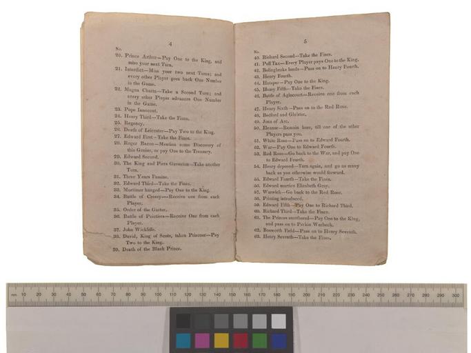 | Keywords: Bodleian Libraries, Rules and directions for playing the Historical pastime or new game of the History of England 163.jpg Game entitled Rules and directions for playing the Historical pastime or new game of the History of England; This game comprehends one hundred and thirty two of the principal circumstances in the History of England commencing with the Battle of Hastings and ending with George the Fourth with appropriate fines or rewards to most of the subjects It is played with a tetotum numbered from 1 to 8 Each player proceeds in the game according to the number he turns and receives the reward or pays the fine appointed There are likewise twelve letters one of which each player must draw; and he who draws the earliest in the alphabet takes the privilege of turning first and the others in rotation Each player must place his letter on the circumstance to which he turns to show his situation in the game If any player turns to that subject on which another has his letter he takes that place and the other moves one forward except at the Holy Lane where as many may be placed as chance may send Each player advances in the game by adding the figure that he turns to the number on which his letter stands Any number of persons may play; and he who arrives first at the Treasury wins the game takes the stakes and all forfeits that remain No 1 Battle of Hastings - pay one to the King No 2 William the Conqueror Take all fines that have been paid to him No 3 Doom's-day book - where every player must enter before he can proceed etc ; Historical pastime or new game of the History of England; Image 4 booklet 24p ; 165 x 105 mm exhibition history Allegro identifier 20030930/17 45 05 jl object history object type Licensed-PD-Art PD-old-100 cc-by-4 0 place of creation London England E Wallis place of discovery http //digital bodleian ox ac uk/inquire/p//1422e4df-dbeb-4904-a576-1f017cb427c0 Digital Bodleian Template John Johnson Rules and directions for playing the Historical pastime or new game of the History of England Uploaded with GWToolset Bodleian Libraries Rules and directions for playing the Historical pastime or new game of the History of England_163 http //iiif bodleian ox ac uk/iiif/image/30cdf971-1c6f-4462-99ce-7acb05bcb826/full/ 1000 1000/0/default jpg Files uploaded by the Bodleian Libraries' Wikimedian In Residence Board game rules History of Great Britain |