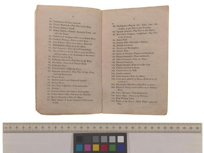 | Keywords: Bodleian Libraries, Rules and directions for playing the Historical pastime or new game of the History of England 162.jpg Game entitled Rules and directions for playing the Historical pastime or new game of the History of England; This game comprehends one hundred and thirty two of the principal circumstances in the History of England commencing with the Battle of Hastings and ending with George the Fourth with appropriate fines or rewards to most of the subjects It is played with a tetotum numbered from 1 to 8 Each player proceeds in the game according to the number he turns and receives the reward or pays the fine appointed There are likewise twelve letters one of which each player must draw; and he who draws the earliest in the alphabet takes the privilege of turning first and the others in rotation Each player must place his letter on the circumstance to which he turns to show his situation in the game If any player turns to that subject on which another has his letter he takes that place and the other moves one forward except at the Holy Lane where as many may be placed as chance may send Each player advances in the game by adding the figure that he turns to the number on which his letter stands Any number of persons may play; and he who arrives first at the Treasury wins the game takes the stakes and all forfeits that remain No 1 Battle of Hastings - pay one to the King No 2 William the Conqueror Take all fines that have been paid to him No 3 Doom's-day book - where every player must enter before he can proceed etc ; Historical pastime or new game of the History of England; Image 5 booklet 24p ; 165 x 105 mm exhibition history Allegro identifier 20030930/17 45 05 jl object history object type Licensed-PD-Art PD-old-100 cc-by-4 0 place of creation London England E Wallis place of discovery http //digital bodleian ox ac uk/inquire/p//1422e4df-dbeb-4904-a576-1f017cb427c0 Digital Bodleian Template John Johnson Rules and directions for playing the Historical pastime or new game of the History of England Uploaded with GWToolset Bodleian Libraries Rules and directions for playing the Historical pastime or new game of the History of England_162 http //iiif bodleian ox ac uk/iiif/image/c2acae27-b077-4a30-92fb-8953118323a7/full/ 1000 1000/0/default jpg Files uploaded by the Bodleian Libraries' Wikimedian In Residence Board game rules History of Great Britain |