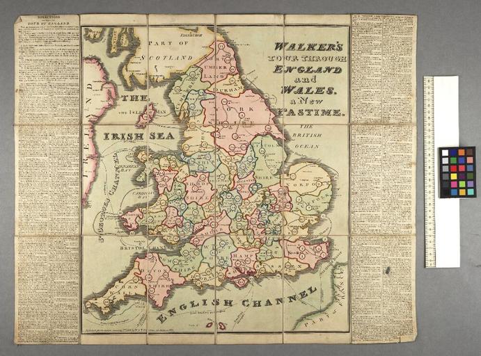 | Keywords: Bodleian Libraries, Walker's tour through England & Wales, a new geographical pastime.jpg s are transcribed above Folded on linen in slip case; Walker's tour through England and Wales a new pastime; Directions for making the tour of England; Maidstone Kent a market town situated on the River Medway There is in this ancient town a manufactory for linen-thread first introduced by the Flemings; also an excellent paper is made here and the townsmen have a considerable trade in hops timber corn orchard fruits c ; Rochester Kent a small but ancient city Here is an Alms-house for six poor travellers who are supplied with a supper a bed and a breakfast and with four pence to carry them on their journey; but they are to stay no longer than one night; and it remarkable that an inscription over the door intimates that 'rogues and proctors are excepted'; Dover Kent a market town and sea port situated at the narrowest part of the channel that divides England from France Quantities of packet-boats pass from this place to France in the time of peace and with a fair wind the voyage is generally made in one tide The Castle a structure of remote antiquity is built on the extremity of the stupendous cliffs which form the eastern barrier to Dover town and harbour; every contrivance has been used to render it impregnable Dover remains to be one of the chief of those ancient port towns on this coast called the cinque ports still distinguished by various privileges; Canterbury an ancient city and the metropolitan see of all England The poorer class of inhabitants find ample employment in the silk cotton and wool trades; and though some of the manufacturers have declined the town possesses a still greater source of wealth in the cultivation of hops which cover many hundreds of acres of land in the vicinity; Margate Kent was til the year 1724 a little mean fishing town; it is now become a fashionable resort for sea-bathing Great quantities of corn are exported hence and vessels are frequently passing to and from the coast of Flanders The buildings still continue to increase in number and elegance and the place abounds with several favourite walks libraries commodious shops and places of public entertainment The assembly room is an elegant and noble building and commands a delightful prospect of the sea; Harwich Essex has always been the chief port for the packets that sail to Holland In the Dutch wars great use has been made of Harwich harbour and formerly there have been seen here 100 sail of men of war with their attendants and between 3 and 400 sail of colliers all riding it at one time and with great safety and convenience; Ipswich Suffolk is a place of considerable size; it boasts of great antiquity Cardinal Wolsey was the son of a butcher of this town By his eminent abilities and the favour of his sovereign Henry the Eighth he rose to the highest dignities of church and state the popedom excepted; an honour to which his ambition aspired but his hopes were disappointed Soaring beyond the condition of a subject he lost the royal favour and in his adversity displayed a most strking example of the instability of all human prosperity; Bury St Edmunds Suffolk a considerable borough and market town most delightfully situated and particularly famed for the salubrity of its air which is deemed the best in England; Norwich the capital of Norfolk This city has undergone many revolutions having been plundered by the Danes restored to a prosperous condition under Edward the Confessor besieged by William the Conqueror and finally rendered an opulent manufacturing city by the settlement of some emigrants from Flanders who introduced the art of weaving crapes and bombazeens and stuffs of various kinds with such success as to supply not only the demand of home consumption but also Holland Germany and the ports of the Mediterranean The charitable institutions of Norwich are uncommonly numerous; Yarmouth has long been known as one of the principal sea-ports of England; is a considerable fishing town has an excellent market place and a very extensive and beautiful quay; Lynn or Lynn Regis is a rich populous place; was once inhabited but by a few poor fishermen is now the residence of many opulent merchants It supplies the midland counties with coals timber and wine; and in return exports corn and malt in very great quantities; Boston Lincolnshire a pleasant wealthy and populous borough and market town the church dedicated to St Botolph is an elegant Gothic structure the tower of which is 300 feet high which may be seen 40 miles round the country and also serves as a guide to mariners when they enter the dangerous channels of Boston deeps; Lincoln is a very ancient city and is a county of itself and has a peculiar jurisdiction extending twenty miles around it The cathedral is a truly magnificent fabric Formerly no city was more rich or populous than this; it is now become much reduced both in trade and population and has no manufactories; Hull is a very large busy place of great trade; the quay is remarkably handsome Hull was the first place to shut its gates against that unfortunate monarch Charles the First when embroiled in a civil war with his parliament; Scarborough is built on a rocky eminence that encircles a bay of considerable extent; the castle is a noble object; the spa is a source of wealth to the inhabitants which with the attractions of sea-bathing draw crowds of polite company hither every summer Here the traveller must stop two turns to see the place; Whitby Yorkshire is a sea-port town of note and contains near 16 000 inhabitants supported by a large foreign trade and some manufactories; Durham a city situated on a singular rocky eminence almost surrounded by the river Weare; its appearance is compact and its figure so striking as to occasion it to be emphatically called the English Zion; Sunderland Durham a sea-port and market town; is large and populous thriving and well built and its sea-men are