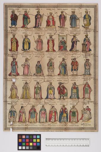 | Keywords: Bodleian Libraries, Whole length portraits of the Kings and Queens of England, displayed in chronological order, exhibiting the age, death, and character of each monarch, with the principal events of their reign.jpg Jigsaw entitled Whole length portraits of the Kings and Queens of England displayed in chronological order exhibiting the age death and character of each monarch with the principal events of their reign; Wooden box with paper-backed wooden pieces In Johnson copy 3 pieces are incomplete with loss of text ; William 1 Norman Conqueror Acc 1066 age 40 Died 1087 Brave and clever but severe Events Curfew bell established New Forest formed; William 2 N Son Acc 1087 age 31 Died 1100 Unjust and cruel Events Holy War began; Westminster Hall built; Henry 1 N Brother Acc 1100 age 32 Died 1135 Learned and accomplished Events First Parliament; Henry's son drowned; Stephen Blois Nephew Acc 1135 age 30 Died 1154 Brave and unprincipled Events 1500 castles erected; Pope appealed to; Henry 2 Plantagenet Second cousin Acc 1154 age 23 Died 1189 Patriotic but superstitious Events Conquest of Ireland; murder of Archbishop Becket ; Richard 1 P Son Acc 1189 Age 32 Died 1199 Brave and generous Events Richard goes to the Holy War; Richard taken prisoner and ransomed; John P Brother Acc 1199 Age 32 Died 1216 Mean and cruel Events John murdered his nephew Arthur; deposed by the Pope; Henry 3 P Son Acc 1216 age 9 Died 1272 Weak and imprudent Events Priest forbidden to marry; the first House of Commons; Edward 1 P Son Acc 1272 Age 33 Died 1307 Brave and ambitious Events King wounded by a poisoned dagger; King's own son called Prince of Wales; Edward 2 P Son Acc 1307 age 23 Died 1327 Weak but good tempered Events Civil Wars with the Barons; King murdered at Berkeley; Edward 3 P Son Acc 1327 age 14 Died 1377 Brave and prudent Events Gunpowder invented Battle of Crecy gained; Richard 2 P Grandson Acc 1377 Age 11 Died 1399 Imprudent and prodigal Wickliffe wrote; Dukes of Hereford and Norfolk banished; Henry 4 Lancaster Second cousin Acc 1399 age 32 Died 1413 Brave and artful Events Earl Percy slain; Plague in London; Henry 5 L Son Acc 1413 age 25 Died 1422 Brave and ambitious Events Battle of Agincourt gained; Henry claimed the crown of France; Henry 6 L Son Acc 1422 age 1 Died 1451 Mild but imbecile Events Joan d'Arc burnt for a witch Civil Wars c lacking text ncaster; Edward 4 York Acc 1451 Age 19 Died 1483 Profligate and cruel Events Edward marries Lady Elizabeth Grey; Earl of Warwick slain; Edward 5 Y Son Acc 1483 Age 13 Died 1483 A hopeful child Events Richard Duke of Gloucester Regent; King Edward his brother murdered ; Richard 3 Y Uncle Acc 1483 Age 33 Died 1485 Ambitious and cruel/ Events Duke of Buckingham beheaded; Queen dies by poison; Henry 7 Tudor Acc 1485 age 28 Died 1509 Brave and covetous Events Perkin Warbeck claimed the crown; death of Prince Arthur; Henry 8 T Son Acc 1509 Age 18 Died 1547 Tyrannical and cruel Events Cardinal Wolsey died; Luther wrote against popery; Edward 6 T Son Acc 1547 Died 1553 Amiable and pious Events Popish images burnt; Prayer Book published; Mary T Acc 1553 Age 37 Died 1558 Bigoted and cruel Events Lady Jane Grey beheaded; 300 Protestants burned; Elizabeth T Sister Acc 1558 Age 25 Died 1603 Vain and tyrannical Events Public worship in English; Spanish Armada destroyed ; James 1 Stuart Second cousin Acc 1603 Age 37 Died 1625 Learned but weak Events Guy Fawkes' conspiracy Present translation of the Bible made; Charles 1 S Son Acc 1625 Age 25 Died 1649 Arbitrary and irresolute Events Money raised without consent of Parliament; Civil War; Charles beheaded; Cromwell Protector Born 1599 Died 1658 Brave and patriotic Events Parliament dissolved; Richard Cromwell deposed; Charles 2 S Acc 1660 Age 30 Died 1685 Wicked and licentious Events Plague and Fire of London; Blood stole the crown; James 2 S Brother Acc 1685 Age 52 Died 1689 Superstitious and obstinate Events Seven Bishops committed to the Tower Prince of Orange called to the throne ; William 3 Orange Son-in-law Acc 1689 Age 39 Died 1702 and generous Events Bill of Rights passed Victory over James at the Boyne ; Anne S Sister Acc 1702 Age 37 Died 1714 Amiable and affectionate Events Victories of the Duke of Marlboro' England and Scotland united; George I Hanover Cousin Acc 1715 Age 54 Died 1727 Brave and prudent Events Pretender son of James in Scotland; inoculation for small pox; George 2 H Son Acc 1727 Age 44 Died 1760 Choleric and generous Events Victory of Culloden; General Wolfe killed at Quebec ; George 3 H Grandson Acc 1760 Age 22 Died 1820 Brave and devout Events Independence of America; Buonaparte dethroned; George 4 H Son Acc 1820 Age 58 Died 1830 Humane and accomplished Events Princess Charlotte died; Queen Caroline died ; William 4 H Brother Acc 1830 age 65 Died 1837 Amiable but weak Events Slavery abolished; Reform Marriage Registration Bills passed; Victoria H Niece Acc 1837 age 18 Events Married Prince Albert; Great Fire at the Tower; Prince of Wales born; Dieu et mon droit; Image 2 box 71 pieces; 171 x 223 x 47 box mm; 450 x 333 made-up jigsaw mm exhibition history Allegro identifier 20040903/15 30 44 jl object history object type Licensed-PD-Art PD-old-100 cc-by-4 0 place of creation London England John Passmore; London England Edward Wallis place of discovery http //digital bodleian ox ac uk/inquire/p//e6070b40-5aff-4555-b0c4-3a736b89d115 Digital Bodleian Template John Johnson Whole length portraits of the Kings and Queens of England displayed in chronological order exhibiting the age death and character of each monarch with the principal events of their reign Uploaded with GWToolset Bodleian Libraries Whole length portraits of the Kings and Queens of England displayed in chronological order exhibiting the age death and character of each monarch with the principal events of their reign http //iiif bodleian ox ac uk/iiif/image/47480700-370d-48fd-b61d-e25bd2ab4c9d/full/ 1000 1000/0/default j