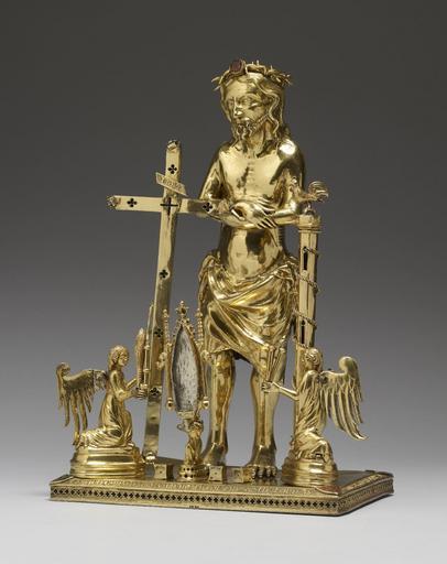 Keywords: Bohemian - Reliquary with the Man of Sorrows - Walters 57700 - Three Quarter Left.jpg The image of the Man of Sorrows is a distillation of the events of Christ's Passion Christ contemplates with sorrow the instruments of his suffering the cross and hammer whips nails column of the Flagellation and the dice thrown by the soldiers for his garments The gabled container held by an angel once housed a thorn believed to be from Christ's Crown of Thorns while the hinged cross and column probably held pieces of wood believed to be from Christ's cross and from the column against which he was whipped According to an inscription on the base the reliquary was ordered by the bishop of Olomouc in Moravia to house the Holy Thorn It was surely a present for Holy Roman Emperor Charles IV Both men's coats of arms those of Moravia and Bohemia are on the base and the thorn was already in the emperor's famous collection of relics as a gift from the king of France As Charles reigned over both Bohemia and Moravia only from 1347 to 1349 the piece dates to this time The sophisticated workmanship is characteristic of objects created for the imperial court in Prague between 1347 1349 Medieval gilded silver silver champlevé enamel glass paste imitation ruby H 11 5/8 x W at wings 8 3/8 x D 5 in 29 53 x 21 27 x 12 7 cm accession number 57 700 29555 Jacques Seligmann Paris date and mode of acquisition unknown Henry Walters Baltimore June 9 1903 by purchase Walters Art Museum Henry Walters Acquired by Henry Walters 1903 Transcription Majuscule inscription on the pedestal HANC MONSTRANCIAM CUM SPINA CHORONE DOMINI DNS IOHANNES OLOMUCZENSIS EPISCOPUS PREPARARI FECIT Translation John the bishop of Olmütz commissioned this monstrance with the thorn of the crown of Christ The Way to Heaven Relic Veneration in the Middle Ages Museum Catharijneconvent Utrecht; Nieuwe Kerk Amsterdam Amsterdam 2000-2001 The International Style The Arts in Europe Around 1400 The Walters Art Gallery Baltimore 1962 Kaiser Karl IV 1316-1378 Bayerisches Nationalmuseum Munich 1978 Die Parler und der Schöne Stil 1350-1400 Schnütgen-Museum Cologne 1978-1979 Reliquaries and Ritual Medieval Objects of Devotion The Walters Art Gallery Baltimore 1984-1985 Highlights from the Collection The Walters Art Gallery Baltimore 1998-2001 Prague The Crown of Bohemia The Metropolitan Museum of Art New York; Prague Castle Prague 1 2005-2006 Silesia - A Pearl in the Bohemian Crown Three Periods of Flourishing Artistic Relations Waldstein Riding School Prague Prague 2006-2007 Treasures of Heaven The Cleveland Museum of Art Cleveland; The Walters Art Museum Baltimore; The British Museum London 2010-2011 place of origin Prague Czech Republic Walters Art Museum license Bohemian Reliquary with the Man of Sorrows in the Walters Art Museum Medieval reliquaries Bohemia Media contributed by the Walters Art Museum needs category review Media contributed by the Walters Art Museum needs artist review |