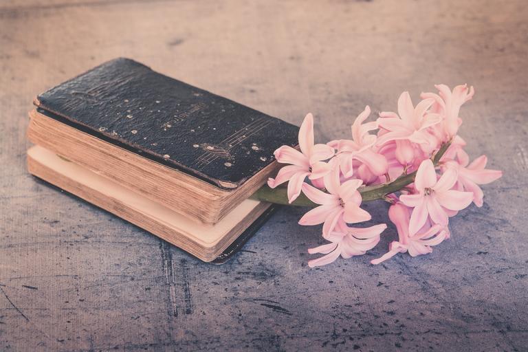 Keywords: book old used flower pink hyacinth fragrant flower fragrant spring flower close