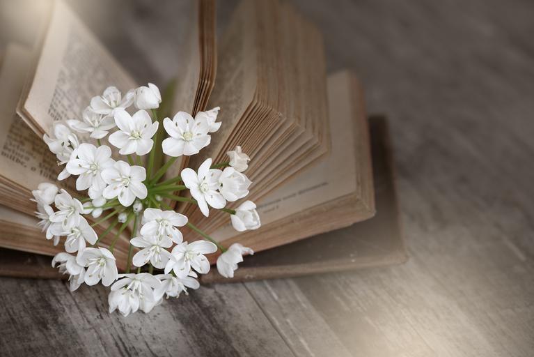 Keywords: book old used old book book pages flower flowers white allium flower still life close