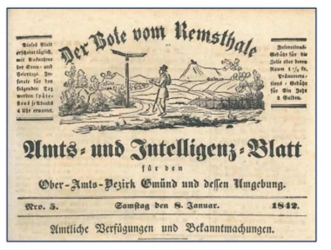 Keywords: Bote remstal.jpg Kopf einer Ausgabe des Bote vom Remsthale http //www schwaebisch-gmuend de/brcms/pdf/veroeffentlichungen_des_stadtarchivs_schwaebisch_gmuend_13 pdf 1842 nicht angegeben Schwäbisch Gmünd PD-old