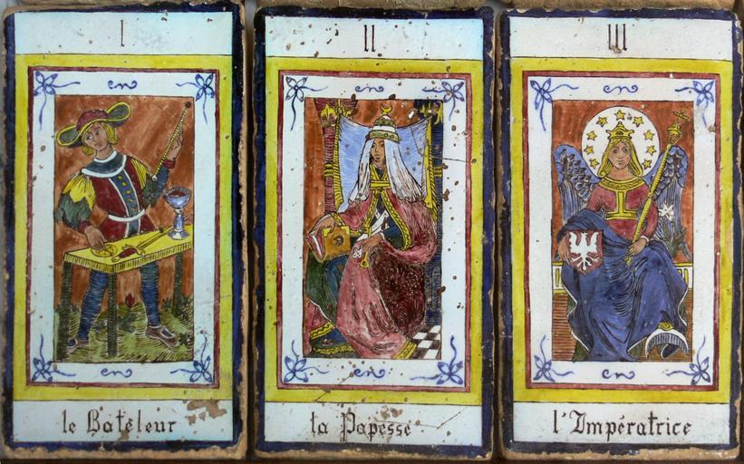 Keywords: Boteleur Papesse Imperatrice.jpg de Bateleur Papesse Impératrice Gaukler Päpstin Kaiserin drei Kacheln eines Sets von Tarot-Karten in Kachelform ausgestellt im Wiener Kunsthandel Bateleur Papesse Impératrice Busker Popesse Emperess own own photograph 2009-11 Photo Andreas Praefcke Own work all rights released Public domain The Empress jpg The Magus jpg The Popess jpg Tiles Magician Major Arcana Popess Major Arcana Empress Major Arcana Photos by User AndreasPraefcke |