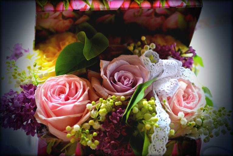 Keywords: bouquet rose liliac flowers box spring