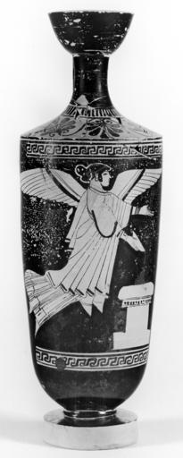 | Keywords: Bowdoin Painter - Shoulder Lekythos Depicting Nike (?) Pouring from a Patera at an Altar - Walters 48257 - Side A.jpg This red-figure lekythos depicts Nike She flies to the right with arms outstretched holding a phiale in her right hand an oval shaped object possibly a fruit or egg in her left Below on the right is an altar with fire on which she pours liquid from the phiale She wears a chiton mantle disc earing and serpentine bracelets Ribbons hold her hair in place Red dots fill much of the picture field; a few to the left of the altar appear to be letters of a nonsense inscription ca 480 470 BC Classical terracotta at shoulder cm 27 7 9 1 h x diam ; at mouth cm 5 5 diam ; at foot cm 5 9 diam accession number 48 257 10430 Joseph Brummer New York date and mode of acquisition unknown Henry Walters city Baltimore Walters Art Museum Henry Walters Acquired by Henry Walters 1924 Inscription Nonsense running vertically to the left of the altar place of origin Attica Greece Walters Art Museum license Ancient Greek red-figure pottery in the Walters Art Museum Bowdoin Painter Media contributed by the Walters Art Museum needs category review Nike in ancient Greek pottery Bowdoin Painter - Shoulder Lekythos Depicting Nike (?) Pouring from a Patera at an Altar - Walters 48257 - Side A.jpg This red-figure lekythos depicts Nike She flies to the right with arms outstretched holding a phiale in her right hand an oval shaped object possibly a fruit or egg in her left Below on the right is an altar with fire on which she pours liquid from the phiale She wears a chiton mantle disc earing and serpentine bracelets Ribbons hold her hair in place Red dots fill much of the picture field; a few to the left of the altar appear to be letters of a nonsense inscription ca 480 470 BC Classical terracotta at shoulder cm 27 7 9 1 h x diam ; at mouth cm 5 5 diam ; at foot cm 5 9 diam accession number 48 257 10430 Joseph Brummer New York date and mode of acquisition unknown Henry Walters city Baltimore Walters Art Museum Henry Walters Acquired by Henry Walters 1924 Inscription Nonsense running vertically to the left of the altar place of origin Attica Greece Walters Art Museum license Ancient Greek red-figure pottery in the Walters Art Museum Bowdoin Painter Media contributed by the Walters Art Museum needs category review Nike in ancient Greek pottery |